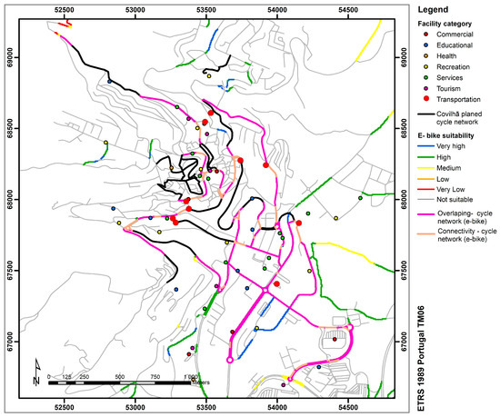 When completed, the planned city’s cycling network will interconnect the main trip generation points in the urban area, covering a total extension of 17.59 km (Figure 2) considering street integration solutions based on street/road hierarchy and traffic flows. A special focus is placed on the connection between educational, residential, and commercial areas.