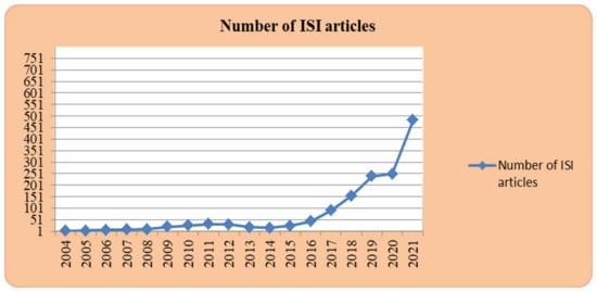 The ISI articles shown in Figure 1 fall into the following areas of research: environmental sciences (42.22%), green sustainable science technology (34.82%), engineering environmental (18.91%), environmental studies (21.05%), management, business, economics (24.86%).