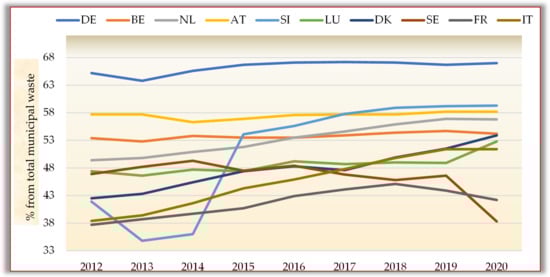 One of the most significant metrics of the circular economy is the recycling rate of municipal waste, which shows us the part of the waste that will be used as a secondary resource. Given that the member states of the EU report each year the amount recycled and the total municipal waste generated in tons, how they are managed differs significantly from country to country [,]. Figure 2 captures the 10 EU countries with the highest municipal waste recycling rates according to Eurostat data. This category includes Germany, Belgium, the Netherlands, Austria, Slovenia, Luxembourg, Denmark, Sweden, France, Italy and Lithuania. The highest percentage of waste recycling, 67%, was reached in Germany in 2020, and the lowest was in 2012 in Lithuania, 23.5%. The municipal wastes are just 10% of the total waste generated from all activities in a country. Compared to the generate waste municipal, the ranking of the waste generation in the EU member states remains the same, specifically, in 2018 the most waste from all activities were generated in Germany, followed by France and then Romania. According to data published by Eurostat, some smaller EU member states generate increased levels of total waste, with high values recorded in Estonia and Finland. Regarding waste treatment, over 50% from generated waste is recycled, and this percentage has gradually increased in the last 15 years. There are significant differences between EU member states regarding waste treatment methods: Italy, Belgium and Germany have high recycling rates, while other states such as Romania, Finland and Sweden opt for waste storage.