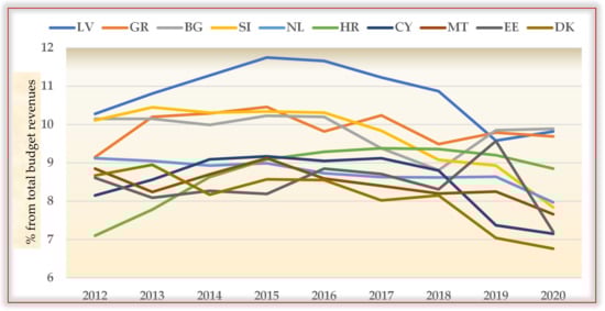 Among the analyzed countries, Latvia has the highest share of environmental tax revenues in total budget revenues with a maximum of 11.75% in 2015. At the same time, Croatia has the lowest proportion for the analyzed countries with 7.1% in 2012. From Figure 3, it can be noticed that the trend in revenues from environmental taxes is a constant one, with a gradual decrease starting in 2018 for most countries.