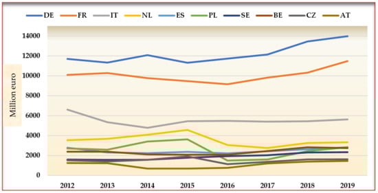 Figure 4 analyzes the trajectory followed by the top 10 EU countries in terms of investments in environmental protection. The highest value was recorded in Germany in the amount of EUR 13.98 billion in 2019, while the lowest was found in Austria in the amount of EUR 690.3 million in 2015. An important aspect to mention is the fact that there are some major differences throughout the period analyzed between the investments made by the first two countries, namely Germany and France, and the following countries such as Italy, the Netherlands and Spain. However, starting in 2017, a constant upward trend can be observed in the case of all countries analyzed.