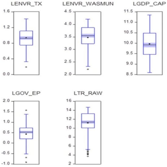 From Figure 5, three of the circular economy indicators, Environmental taxes, Trade in recyclable raw materials and Recycle rate of municipal waste are within normal parameters; only Environmental protection expenditures shows a slight deviation. The values of the variables used are logarithmic to facilitate the interpretation of the coefficients obtained from the regression.