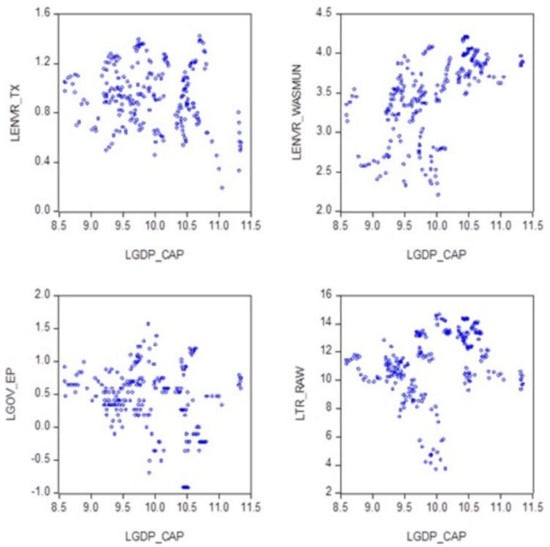The scatterplot in Figure 6 shows the correlation of GDP per capita with each of the four independent variables. As can be seen, data sets for environmental taxes and environmental protection expenditures have been concentrated. As for the other two variables, recycle rate of municipal waste and trade in recycle raw materials, the correlation with GDP per capita is slightly positive.