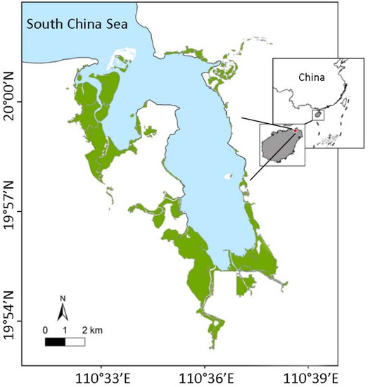 The Dongzhaigang Bay mangrove area is located in northeastern Hainan Island, China (110°32′–110°37′ E, 19°51′–20°1′ N; Figure 1), and harbors a rich diversity of animals and plants, both terrestrial and marine. The mangrove area is 33.4 km2, and the tides are irregularly semi-diurnal with an average range of 1.3 m. The tropical monsoon climate has an annual average temperature currently ranging from 23.3 to 23.8 °C and annual precipitation of 1676 mm.
