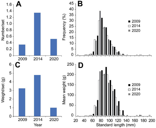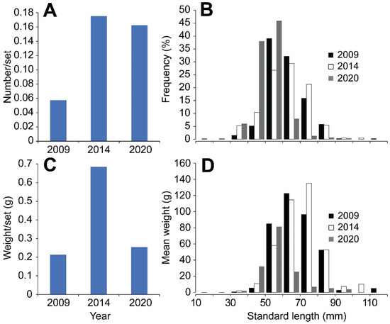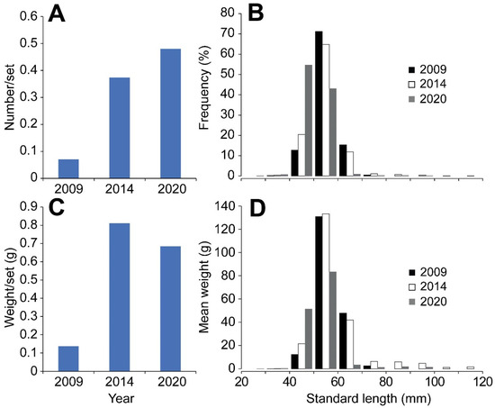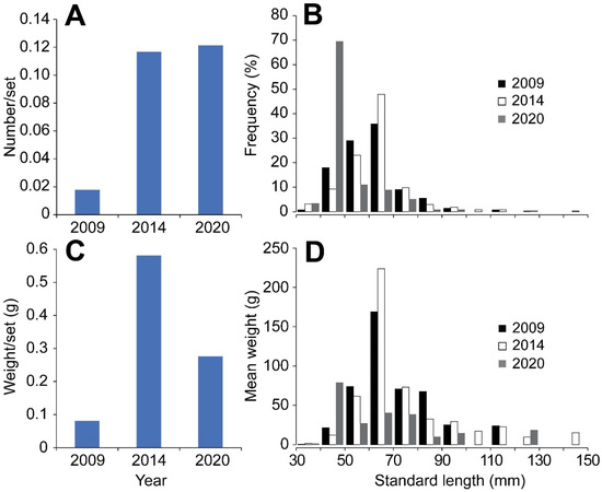 Size distribution of the catch of spotted green goby (Acentrogobius viridipunctatus) in 2009, 2014 and 2020. (A) Total catch effort per set of spotted green goby in three periods; (B) frequency of spotted green goby by length class; (C) total weight per set of spotted green goby in three periods; (D) weight of spotted green goby in different length class (corresponds to their frequency in (B)).