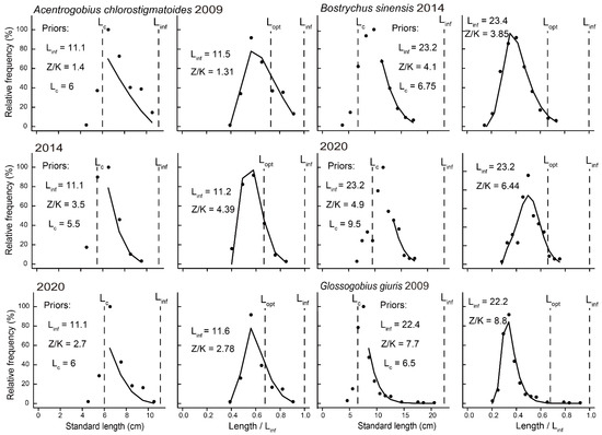 Table 2 gives the LBB results for all 26 of our species. Figure 6 illustrates the application of the LBB method to three species, i.e., greenspot goby (Acentrogobius chlorostigmatoides), for which three years’ worth of L/F data were available, four-eyed sleeper (Bostrychus sinensis), with two years of L/F data, and tank goby (Glossogobius giuris), with one year of L/F data. The graphical results of the LBB for the remaining 23 species are given in the Supplementary Materials.