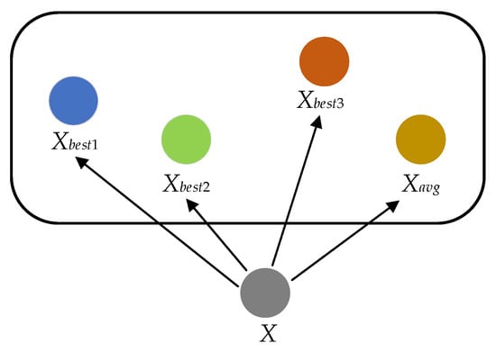 where , and are the top three individuals with the best population fitness values in the t-th iteration, respectively, denotes the average position of the elite population and N is the population size.