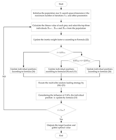 - According to Formulas (16)–(21), execute the multi-elite random leading strategy to update the individual position of the prey.