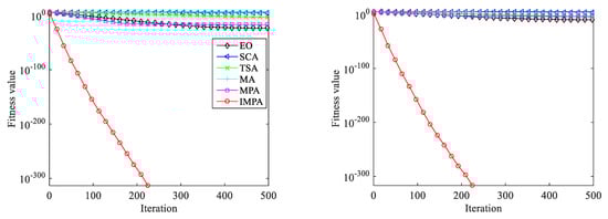 In order to fully verify the effectiveness of the proposed IMPA, the IMPA is compared with other classical metaheuristic algorithms, such as the sine–cosine algorithm (SCA) [28], tunicate swarm algorithm (TSA) [29], mayfly algorithm (MA) [30], and equilibrium optimizer algorithm (EO) [31]. To ensure the fairness of the algorithm comparison, the population size N = 30, and the maximum number of iterations = 500. To avoid the contingency of running the results of the algorithms, all the comparison algorithms were independently run 30 times on 11 benchmark functions, and the mean, standard deviation, and average time consumed were taken as the final evaluation indicators. The detailed comparison data are shown in Table 3. In the table, Mean is the average optimal fitness value, Std is the standard deviation, and Time(s) is the average time consumed.
