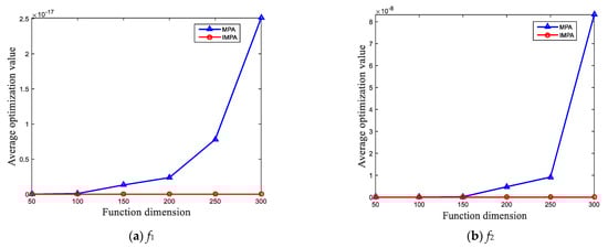 Given the limited space, this section selects two single-peak test functions (f1, f2) and two multipeak test functions (f7, f9). The dimensionality is varied in 50-dimensional increments from 50 to 300 dimensions, and the mean and average rate of change of the algorithm’s solutions are used as evaluation metrics. To avoid the contingency of the experimental results, the proposed IMPA and the standard MPA were run independently 30 times, and the average value of the fitness with the function dimension was recorded. The parameter settings are the same as in Section 4.2, and the experimental results are shown in Table 4. The mathematical model for the average rate of change (ARC) is as follows: