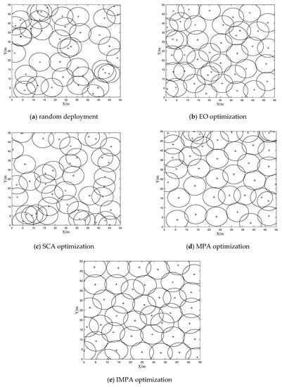 To verify the effectiveness of IMPA in solving the WSN coverage problem, the IMPA, EO algorithm, SCA and the original MPA are simulated. The experimental data are shown in Table 9. Figure 5 shows the node coverage graph of the proposed IMPA, random deployment, and optimization of each algorithm.