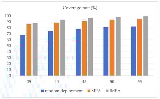 To further explore the influence of the number of sensor nodes on the WSN-optimized node coverage, simulation experiments were carried out on different sensor nodes for each algorithm (random deployment, MPA and IMPA) in the target area. The number of isomorphic sensor nodes is set to 35, 40, 45, 50, and 55, and the other parameters are consistent with Table 8. The variation trend of the coverage ratio of different algorithms with the number of nodes is shown in Figure 6.