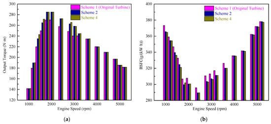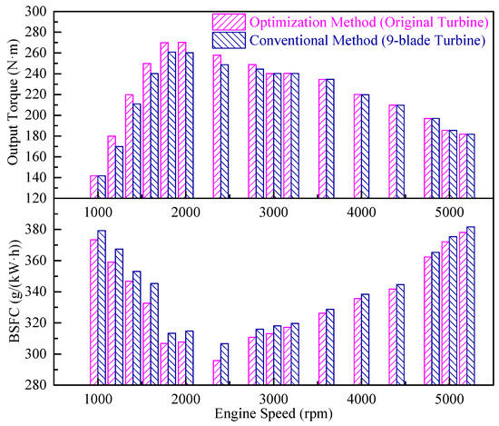 - The turbine structure determined using the optimization method showed clear advantages. The findings of the study were verified using performance tests. The engine 1D performance simulation further showed that the maximum torque of the engine with the 9-blade, twin-entry turbine was 5.4% higher than that of the original engine and that the minimum BSFC was reduced by 2.1%.