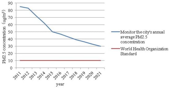 In the process of industrialization, many countries have encountered serious haze pollution and governance problems. The Industrial Revolution began in the UK, which was also the first country to have environmental problems. China’s economy has expanded rapidly since the reform and opening up, but the extensive economic development model has seriously damaged the ecological environment. Many cities in China have suffered from haze in recent years. According to the 2021 China Eco-Environment status Bulletin (see more details at: https://www.mee.gov.cn/hjzl/sthjzk/zghjzkgb/ (accessed on 27 May 2022)), the average PM2.5 concentration in 339 cities in China was 30 μg/m3, which severely exceeded the average annual limit of 10 ug/m3 set by the World Health Organization []. Although, compared with 2011, China has made some progress in control, the haze problem is still serious (see Figure 1). Many studies have shown that severe haze pollution not only harms residents’ health, induces asthma, cancer, and other diseases, and increases mortality [,,,,], but it also adversely affects economic growth [,,,,]. Therefore, tackling haze pollution has become a key component of sustainable development.