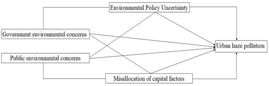 At present, many scholars have carried out a large amount of research on the relationship between government environmental concern, public environmental concern, and environmental pollution. However, the literature incorporating government environmental concern and public environmental concern into the same research framework is limited, and few scholars analyze the mediating role of environmental policy and capital factor allocation in their relationship. Therefore, this paper incorporates the dual-subject environmental concerns of the government and the public, environmental policy uncertainty, capital element mismatch, and haze pollution into a unified framework and discusses the relationship between them.