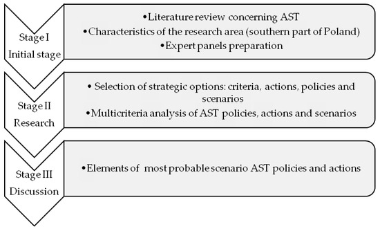 Stage II was the research on the multicriteria analysis of AST projects that could be implemented in southern Poland. First, the lists of measurement criteria, policies, actions, and scenarios were prepared and evaluations by experts were gathered. It allowed MULTIPOL computer program software use to select the most probable scenario to implement the most favorable AST policy, helping to verify which actions have no chance of development in the assessment of stakeholders.