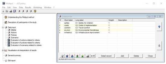 The authors of this paper prepared the materials for the expert group. Each expert received a document containing a list of key strategic indicators, key strategic actors, and related key strategic goals, as well as possible scenarios, previously developed based on the literature and analysis of regional activities in the field of active school transport. The workshop ended with the definition and selection of a common consensus on a list of measurement criteria, policies, actions, and scenarios, which allowed for the subsequent selection of strategic options. The common list of parameters obtained in the course of the brainstorming allowed for the implementation of the input data to the MULTIPOL program, which is illustrated by the example of entering the criteria in Figure 3.