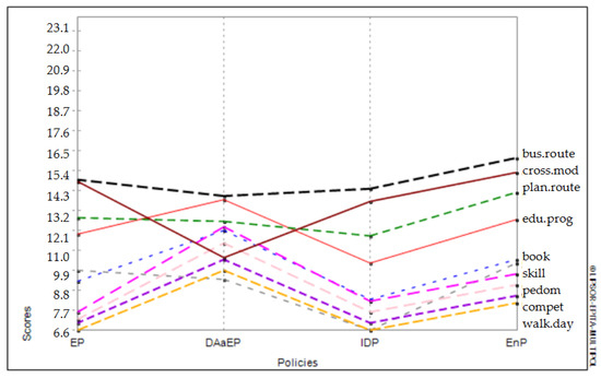 As shown in Figure 4, the walking school bus routes identification actions are superior in all types of policies. In the Developing Activities and Events Policy (DAaEP), it has a similarly high score combined with the actions related to promoting safety educational programs (buss.route). In Educational Policy, as well as the Infrastructure Development Policy (IDP) and the Enforcement Policy (EnP), the next action so highly evaluated is related to the modernization of crosswalk lines (cross.mod). Creating reward systems for actively commuting pupils (reward) was evaluated as the weakest according to almost every AST policy.