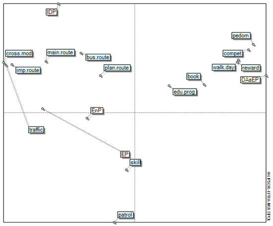 Figure 5 presents the results of MULTIPOL in the form of a closeness map or closeness between programs (actions) and policies (policy) derived from correspondence analysis. The correspondence analysis on the matrix is evaluated from the actions related to policies, with the action score on the x-axis and the standard deviation on the y-axis. As shown in the closeness map, there are five actions (together with the three highest ranked) mostly related to the Infrastructure Development Policy (IDP). Changing the organization of road traffic near schools (traffic) actions are closest to the Enforcement Policy (EnP). The Educational Policy (EP) gathered two actions, but one was more correlated: cycling and pedestrian skills training workshops (skill). The Developing Activities and Events Policy (DAaEP) gathered six actions.