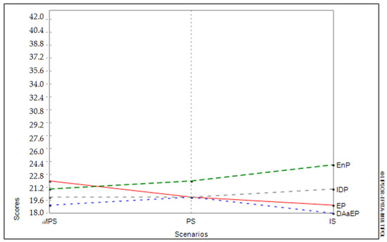 All policies and each scenario were assessed with the criteria by the expert in the way that the weight per row of the interaction was 100. The MULTIPOL application allowed for the presentation of a graphical interpretation of the policies related to the scenarios matrix profile map, as shown in Figure 6. It presents calculations of the set of weights of the matrix evaluation of policies related to the criteria of the matrix of scenarios.