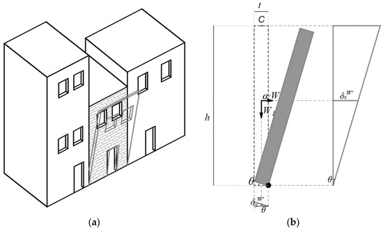 (a) Façade wall subjected to a global simple overturning; (b) overturning façade in the deformed configuration with acting forces and virtual displacement without considering any interaction among the units (no aggregate effect).