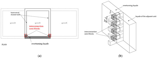 (a) Plan view of the structural unit where the interconnection semi-blocks between the overturning façade and the transverse walls shared with the adjacent units are evidenced; (b) profile of the interconnection semi-blocks.