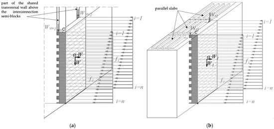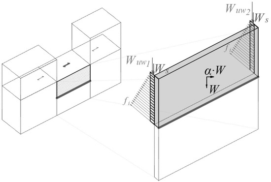 - Wuw1 and Wuw2 are the weights of the transversal walls placed above the interconnection semi-blocks, respectively, on the right and on the left side of the façade (Figure 3a),