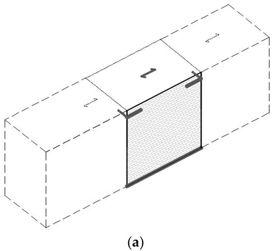 However, in the case of aggregate buildings the mutual interaction among adjacent structural units can play an important role, as suggested in recent studies [25] and in the instructions of the Italian code [26]. The effect of interaction can be introduced in terms of frictional forces acting at the interconnection semi-blocks [34,35,36,37] when the overturning façade and the transverse walls of the adjacent units are connected as shown in Figure 2a,b.