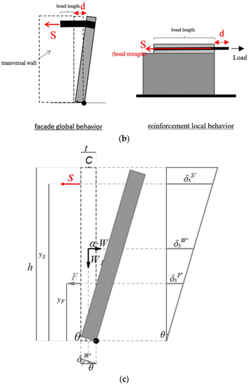 Similarly to friction, the contribution of the strengthening system, activated at the beginning of the out-of-plane mechanism, evolves during the progress of the kinematics of the façade subjected to overturning. Indeed, similarly to what happens during a single-lap shear bond test [17], the reinforcement contribution depends on the displacement at its loaded end which, as shown in Figure 4b, corresponds to the lateral displacement of the façade in its out-of-plane overturning direction. Consequently, the contribution of the reinforcement can be provided by the nonlinear force-displacement law directly deduced from a shear lap test related to the reinforcement/support specimen.