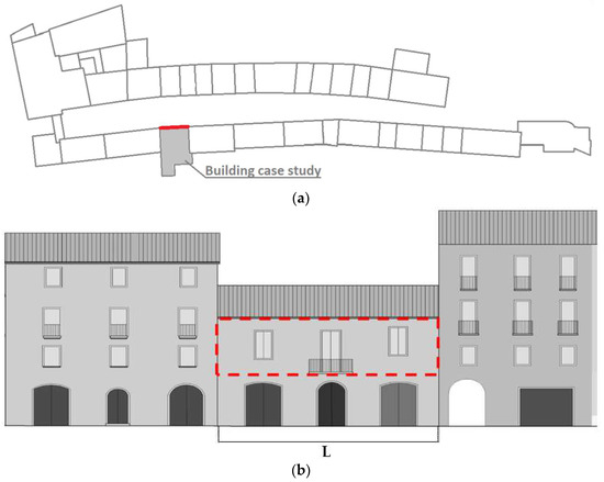 (a) Borgo San Rocco’s plan (the analyzed façade is reported in red); (b) prospectus of the analyzed S.U. (the portion of the overturning façade is reported in red).
