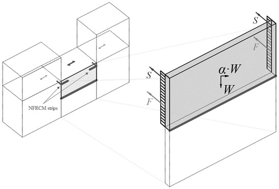 The use of externally applied fiber reinforced composite materials to masonry buildings represents an efficient and, nowadays, increasingly used solution as already discussed in the introduction of the paper. Generally, in the case of overturning mechanisms of an S.U. façade belonging to an aggregate building, the FRCM material is applied as strips along the wall prone to the mechanisms and fixed to the adjacent orthogonal walls as schematically shown in Figure 4a.