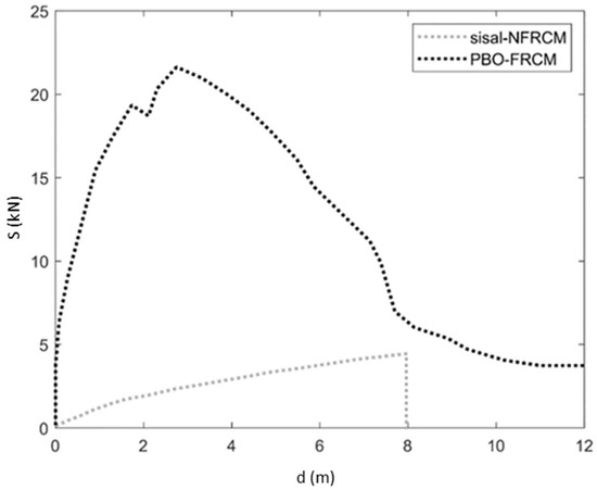The force-displacement curves S–d (where the slip d at the end of the loaded end of the strip during the shear lap tests corresponds to the displacement of the façade at the section where the reinforcement is applied as shown in Figure 4b) obtained for the two types of accounted strengthening systems are reported in Figure 9. From the figure the different local behaviors in terms of stiffness, strength, and post-peak phase (the latter underlines a fragile behavior of natural fibers due to the tensile rupture of fibers during the tests) are evident.