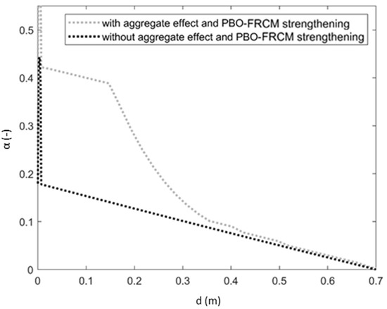 The kinematic analysis of the overturning portion of the façade with the contribution of the strengthening has been carried out following the procedure illustrated previously in Section 2.2. The obtained capacity curves of the façade are reported in Figure 10 and Figure 11, respectively, for natural fibers and PBO, where the black curve refers to the case without the aggregate effect and the grey curve to the case with the aggregate effect.