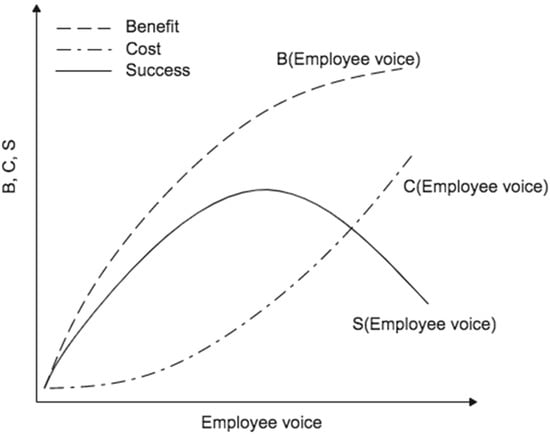 Combination of benefits and costs of employee voice resulting in an inverted U-shaped relationship (B (employee voice) = benefit; C (employee voice) = cost; S (employee voice) = combination of benefits and costs (i.e., benefits minus costs)).