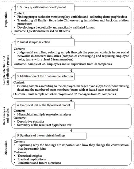 Multisource data were collected from 30 companies selected through the personal contacts in our social networks in different industries. We first approached the company’s human resources department through invitation emails that explained our study goals and design and obtained a letter of support from them. Then, we invited managers and their employees to complete online surveys, as these companies are located in different cities. Upon accessing the online survey system, participants first read an overview of the study. Then, they were led to an initial survey that contained measures of demographics. After that, employees were led to the measures of their voice behavior, and managers were led to the measure of performance evaluations for each employee. All these employees and supervisors were informed that participation was voluntary, and confidentiality was ensured. To provide the readers with a clear view of the whole process of sample selection, data collection, and the results, Figure 3, reworked from Hristov, Cimini, and Cristofaro [], systematically reports the research methodology steps.