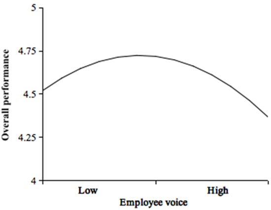 Hypothesis 1 proposed that the frequency of employee voice has an inverted U-shaped relationship with managers’ performance evaluations. To examine the inverted U-shaped relationship, we employ the quadratic specification that could quantitatively capture the predictions of Hypothesis 1, which is frequently used in similar studies (e.g., [,,]). Specifically, we regressed the dependent variable overall performance on the independent variable employee voice and its square. It is essential to include the first order in the regression equation [], as leaving it out is tantamount to assuming that the turning point is at employee voice = 0. As shown in model 3 of Table 2, the quadratic term of voice is negatively related to performance evaluations (β = −0.41, p < 0.05). Consistent with Hypothesis 1, the simple slopes of the regression line at the very low (2 SD below the mean), low (1 SD below the mean), medium, high (1 SD above the mean), and very high (2 SD above the mean) frequencies of voice (β = 0.81, p < 0.05; β = 0.36, p < 0.05; β = −0.09, n.s.; β = −0.54, p < 0.05; β = −0.99, p < 0.05) showed that a moderate frequency of employee voice positively affects overall performance but that very high frequencies of employee voice degrade overall performance. Taken together, the coefficient of the quadratic term of voice is significant and of the expected sign (negative for inverted U). At the same time, the slope of the curve is sufficiently steep at both ends of the voice range. These results indicate that there is an inverted U-shaped relationship between employee voice and overall performance [,,]. Thus, Hypothesis 1 is supported, as shown in Figure 4.