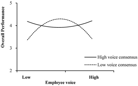 When an employee’s voice frequency is similar to that of his/her coworkers (high voice consensus), managers have a high base-rate expectation that most team members behave in the same way []. In this situation, the focal employee’s voice behavior is externally justified and appropriate []. Consequently, managers’ perceptions of threats will be alleviated. Therefore, in high-voice-consensus contexts, regardless of whether employees’ voice frequency is low or high, managers tend to view their voice in a positive light and reward them with favorable evaluations.