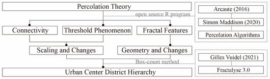 Percolation has three characteristics: threshold phenomenon, fractal phenomenon, and connectivity [28]. In fact, these three properties have a complementary relationship. The threshold phenomenon represents the morphological transition and critical phenomenon in the agglomeration process of street intersections; the fractal phenomenon expresses the morphological similarity and change process between different groups in the results of percolation analysis; and connectivity expresses the implicit relationship between street intersections. In summary, we apply percolation theory to street intersections in the city center to further understand the hierarchical structure of the city center at different scales. The main research methods and workflow of this study are depicted in Figure 1.