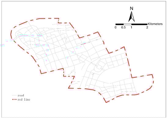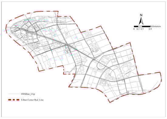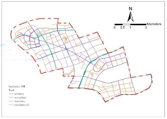 First, the preliminary acquisition of OpenStreetMap (OSM) data and the definition of the central area of Lujiazui, Shanghai are as follows. This study obtained data from OSM (https://www.Openstreetmap.org/#map=6/46.449/2.210, accessed on 11 July 2021) to collect the street network data of the central area of Lujiazui, Shanghai, and imported it to GIS. We referred to Yang and Hu’s method of defining the boundary of the urban central area [4], learning that the urban central area of Lujiazui is about (Figure 2). On this basis, the redundant road types in the obtained OSM data were screened and eliminated, and finally four levels of roads in the central area of the city (primary, secondary, tertiary, and residential roads) were retained (Figure 3).