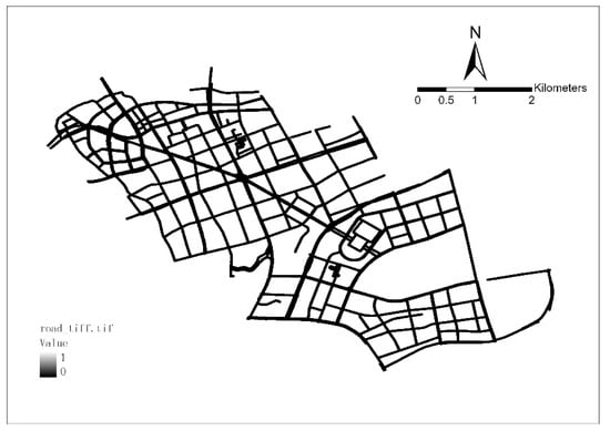 Second, OSM road centerlines were extracted. A 25-m buffer analysis was performed on the OSM road network by preliminary sorting, and the TIFF image in a monochrome threshold format with color mode 1 was exported (Figure 4). ArcScan was used to vectorize the exported TIFF image of the central area of Lujiazui, and the road centerline of the central area of Lujiazui was finally extracted (Figure 5).