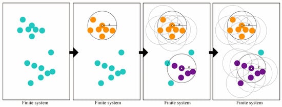 The clustering features obtained by the percolation analysis are defined by a given distance threshold (). The technique selects an arbitrary point as a starting point, defines the distance threshold () as the radius of cluster selection, and performs cluster analysis by identifying “points” that fall within the range. Subsequent distance thresholds () will follow this definition. Specifically, the percolation analysis algorithm based on street intersections pays attention to the Euclidean distance between two-dimensional points. If the Euclidean distance is less than the given distance threshold (), then the feature point is assigned to this cluster; if a cluster has less than two feature points, then it is determined that the cluster does not exist. Eventually, all points at different locations will be detected and classified. It is worth noting that the City Clustering Algorithm (CCA), which is based on the identification of population density to determine the urban boundary, was developed based on the percolation theory.