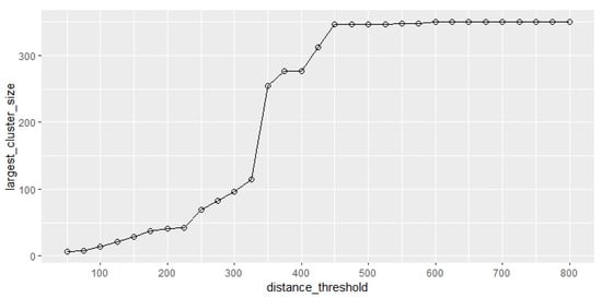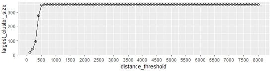 The third set of parameters’ threshold range was 100–8000 m. To include the entire central area of Lujiazui in our range, we set 8000 m as the maximum distance threshold to analyze its variation characteristics, that is, a radius of 100 m as the step size, 100 m as the minimum distance threshold (), and 8000 m as the maximum distance threshold (). The percolation clustering characteristics did not change after the distance threshold () was set to 500 m (Figure 10).