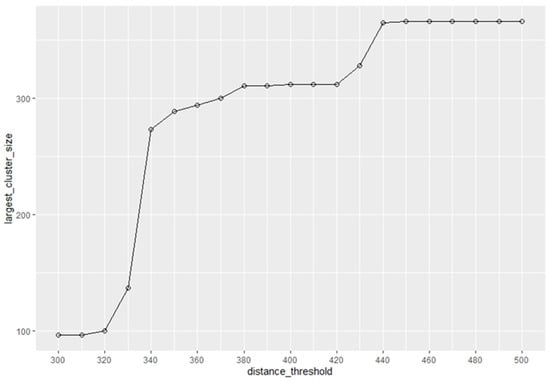 The second set of selected parameters had a threshold range of 300–500 m. As the slope of percolate changes between 300 m and 500 m appeared to be larger compared with the analysis results of the first group, we decided to perform a detailed percolation analysis on this range to identify any subtle changes. We took 50 m as the radius step, 300 m as the minimum distance threshold (), and 500 m as the maximum distance threshold () (Figure 9).