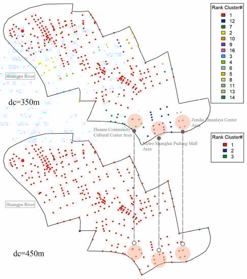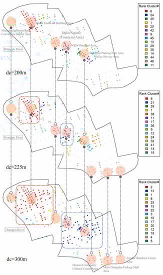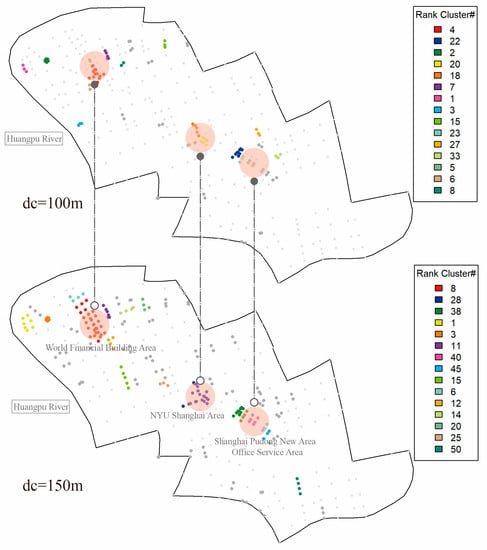 We further scrutinized the percolation results obtained with different distance thresholds (). The clusters were divided into 15 cluster levels according to the percolation process: the red cluster represents the highest level, and the blue cluster is the second highest level. The clustering feature of sites below level 15, indicated in gray, was not obvious. We extracted the distance thresholds () with salient features for analysis as depicted in Figure 11, Figure 12 and Figure 13, the hierarchical clustering being a step length of 25 m and a maximum radius distance threshold of 500 m.