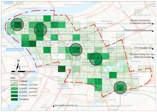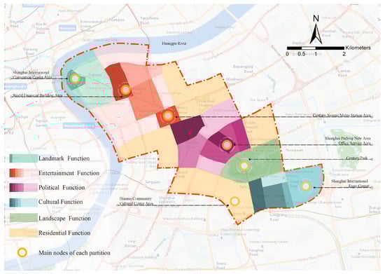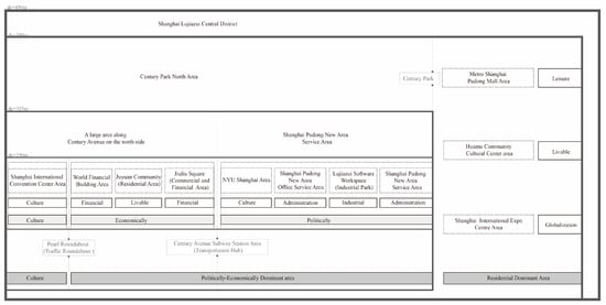 It is evident that the central area of Lujiazui, Shanghai, is bounded by Century Park and is divided into an “economically and politically dominated area” on the northern side and a “residentially dominated area” on the southern side. The northern area of Lujiazui, which is bounded by the Century Avenue Metro area, is divided into an “economically dominant area” and a “politically dominant area”. It is worth noting that the Shanghai International Conference Center area at the “fish mouth” of Lujiazui serves as a cultural node space for “guidance” and “sign” in the northern area of Lujiazui and plays an important role in the central area of the city (Figure 15). It is worth noting that Phearson [30] argues that sustainable cities have redundant and resilient modular subsystems. The hierarchically nested structure obtained in this study also expresses a similar elastic system to a certain extent, which may further deepen the understanding of the structure of urban central areas.