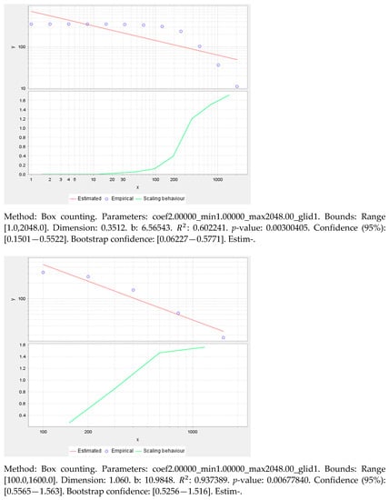 The number of points that fall into the grid are counted as the evaluation process of the box counting method. The sequence of points (, ) is formed into an empirical curve. If the empirical curve follows the fractal law, the corresponding estimated curve form is a power-law distribution (such as a parabola). The formula is: