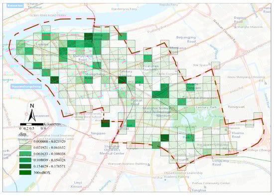 Finally, we can record that the fractal characteristics of Shanghai Lujiazui city center obtained by the box counting method were not obvious when the box size was about 300 m (Figure 17). The avenues were distributed on the axis, and the percolation analysis reached the most significant fractal characteristics at this time (Figure 18). The clustering features with Century Avenue as the axis centered on the Shanghai International Conference Center area, Century Avenue Subway Station, Metro Shopping Mall area, and so on, had a certain similarity with the percolation clustering features at the intersection of street. When the size of the box was about 900 m, with the Shanghai Pudong New Area People’s Government area and the Shanghai International Convention Center area as the two cores, the overall box count presents a relatively uniform distribution dimension (Figure 19).