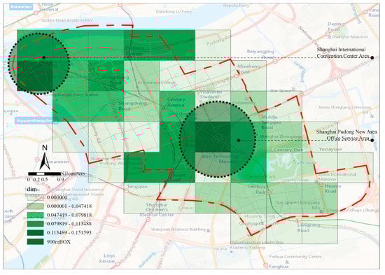 We further observed that there were multiple cores between and , forming a process of expanding to the center, with Century Avenue as the axis. When , a relatively stable multi-core structure feature was formed, and the fractal feature obtained at this time was the most obvious. It is worth noting that, when , with the business district of Century Avenue Metro Station as the divider, the degree of agglomeration was strengthened, and there was an obvious two-level differentiation on both sides. We noticed that, while the two major cores are “competing” for development, with Century Park as the boundary, new clusters of clusters gradually emerged in the opposite area. This shows to a certain extent that the existence of natural elements, such as parks, had a restrictive effect on the agglomeration and development of cities. On the whole, this transition process also gradually presented a process of evolution to the Century Avenue Subway Station Area which somewhat reflected the importance of the development and construction of the Century Avenue Subway Station Area in the future urban central area (Figure 12).