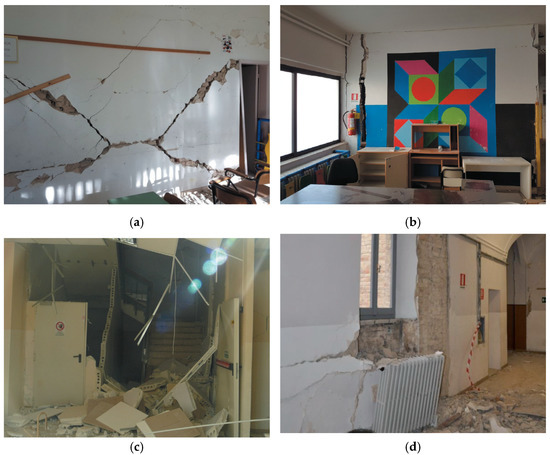 Damage to school buildings after 2009 L’Aquila earthquake: (a) diagonal and (b) vertical cracks in masonry infill panels; (c) collapse of internal partitions and damage to stairs; (d) damage to non-structural and heater elements (Di Ludovico et al. [7]).