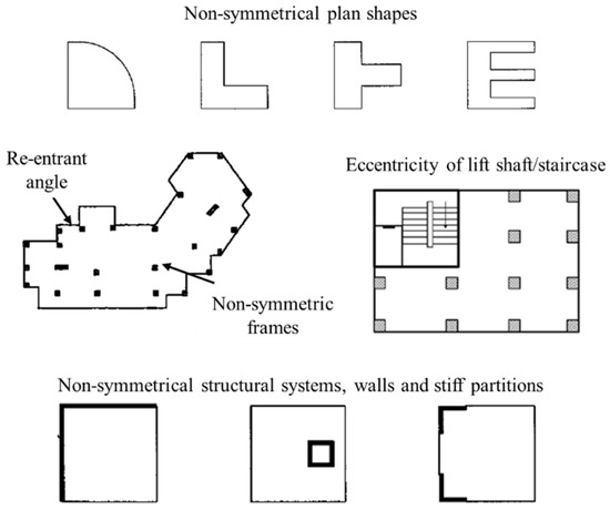 Geometric criticalities: examples of plan irregularities (from NZSEE 2017 [9] and Baggio et al. [21]).